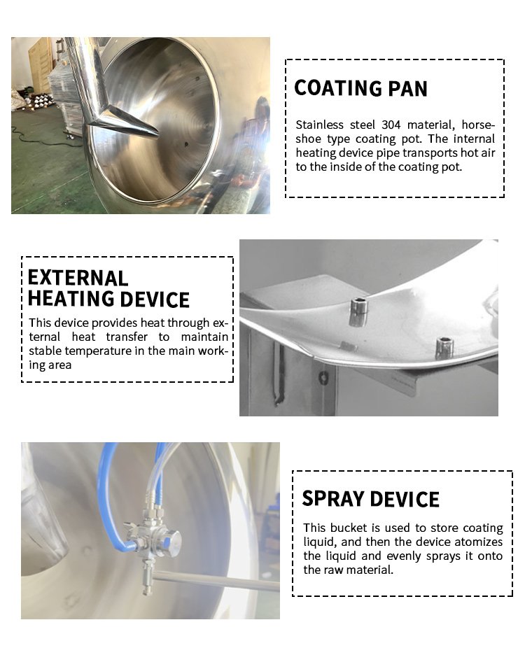 This machine is mainly used in the pharmaceutical industry for producing sugar coatings on pills and tablets. It can also be used in the food, light industry, and chemical industries for rolling, mixing, and polishing spherical or granular materials. Examples include: chocolate polishing, peanut coating, sugar coating, seasoning, making tangyuan (glutinous rice balls), tapioca pearls, rolling desiccants, producing chemical fillers, aluminum hydroxide balls, alumina balls, ceramic molecular sieve balls, ceramsite, catalysts, and more.