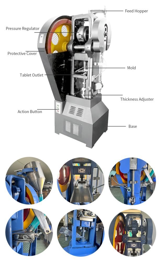 • It is used in small batch production, laboratories, hospitals and other departments to press tablets, catalysts, sugar tablets, calcium tablets, coffee machines, powder metallurgy, electronic components, and various agricultural fertilizer tablets.