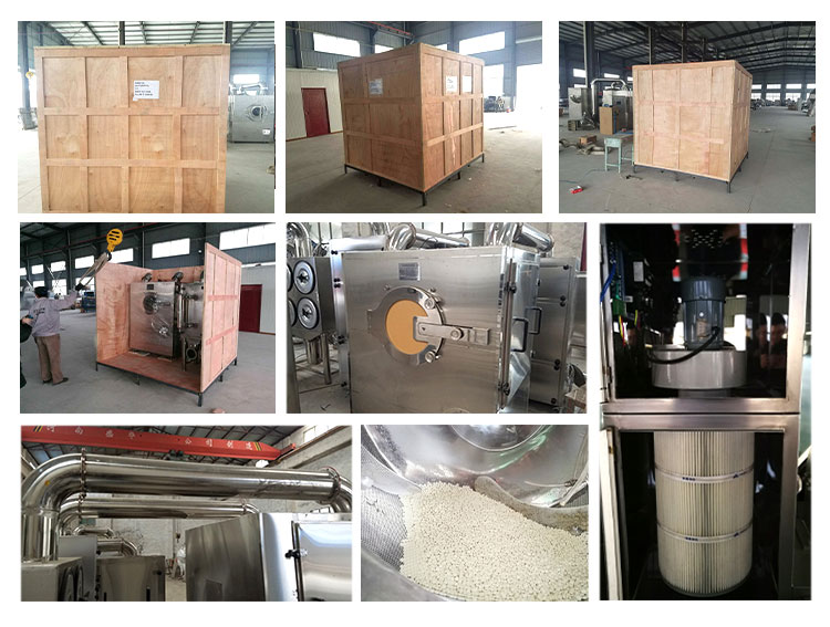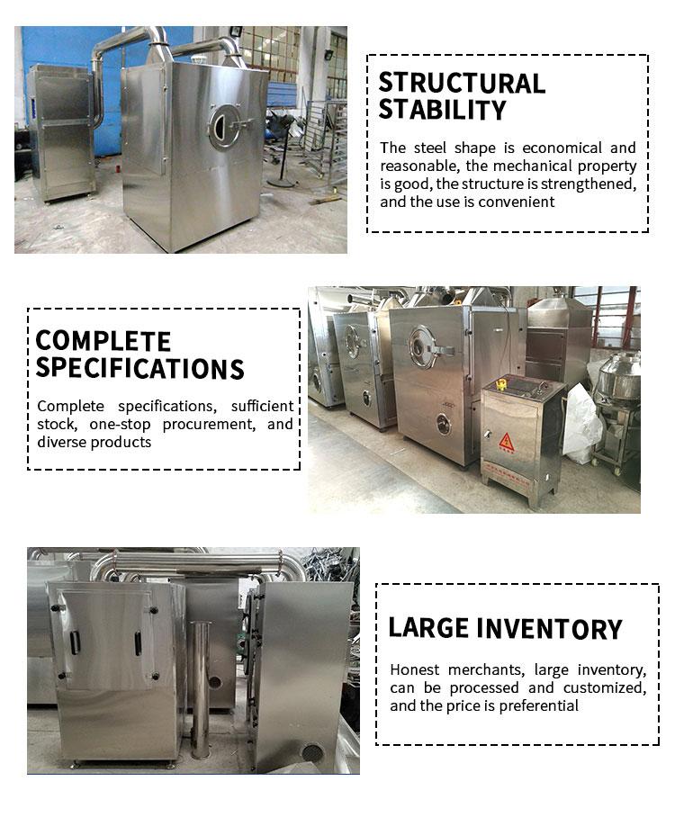 The machine is used for sugar coating of tablets and pills in the pharmaceutical and food industries,It can also be used for rolling and heating beans and edible seeds.The titling angle of the sugar coating pot is adjustable,and the electric furnace or gas heater can be placed under the pot. An individual electric heating type blower is attached to this machine.The air outlet pipe can be stretched into the pot to carry out heating or cold blowing and the heat is adjustable.