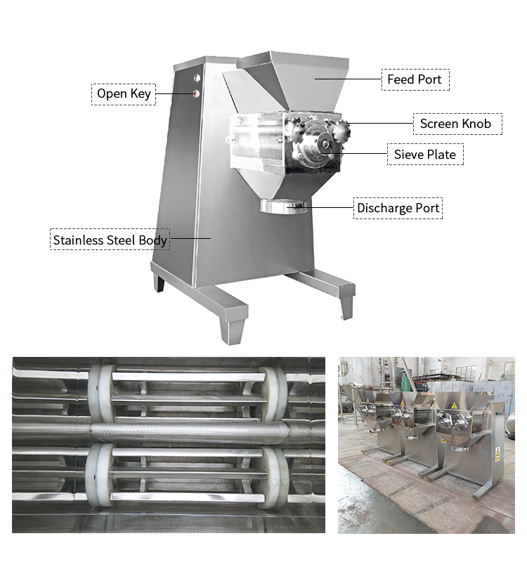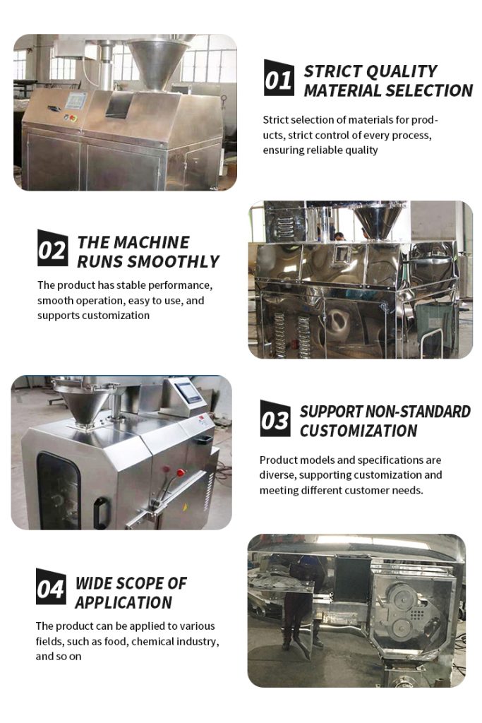 The machine is widely applied in such industries as medicine,food, medicinal granules, chemical industry and solid beverage.It can make mixed materials into desired granules or smash waste tablets and dried cubes and roll them into granules.It is especially suitable for highly viscous materials.