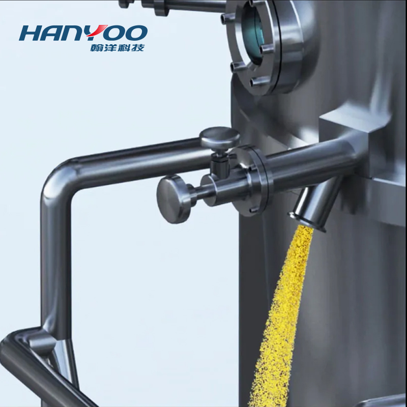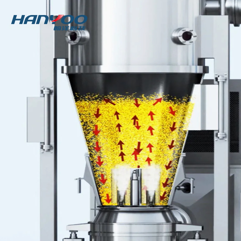 • After filtered by the air handling system and heated by the heating system, the air enters the main machine. After going through the slurry handling system, the slurry is sent to the spray gun and sprayed to the materials inside the cavity, and then is bonded with powder to form granules.