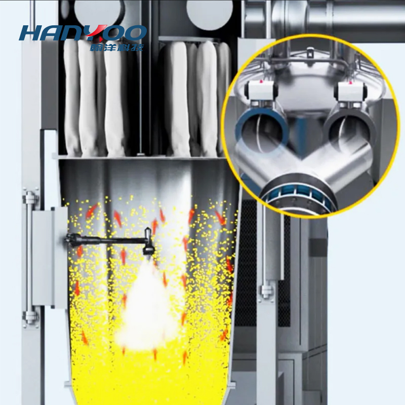 • After the operation is completed according to the set programs and parameters, the silo is pushed out and connected with the lifting material transferring machine for lifting discharging or the vacuum feeder is used to pump the materials to a high position for granule sizing by the granule sizing machine, so as to effectively control dust pollution and cross contamination.