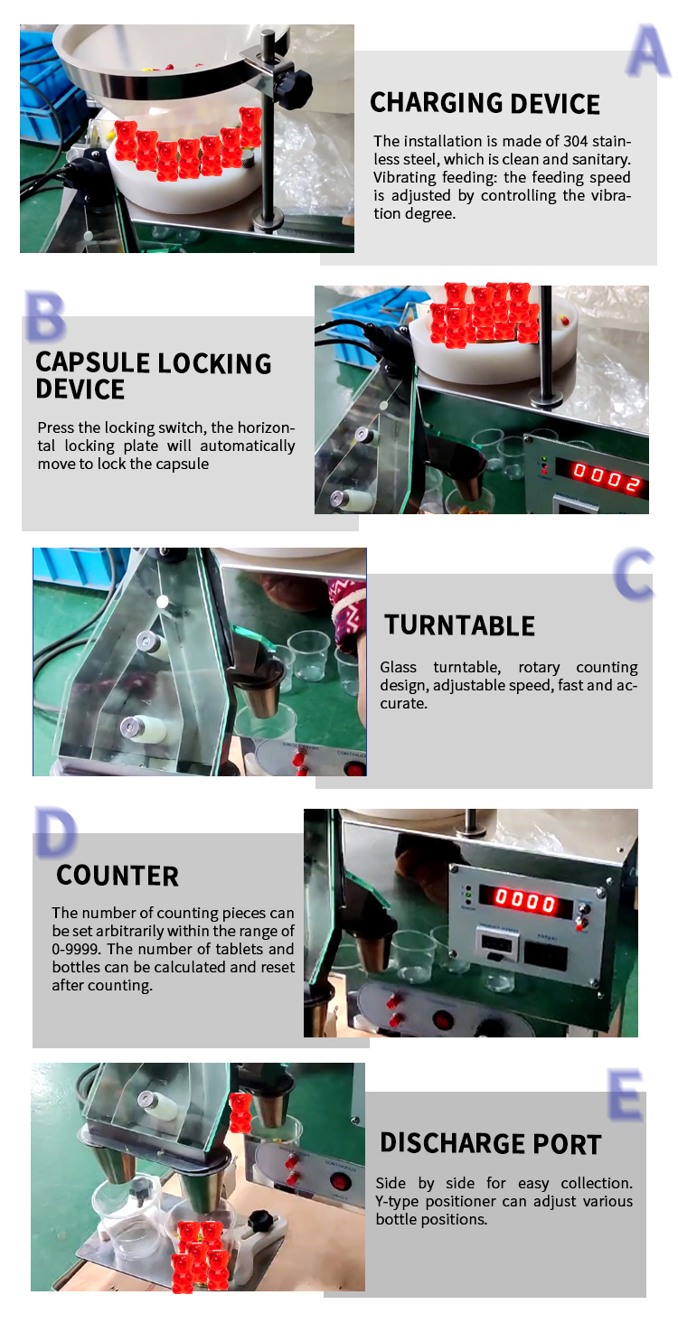 This machine adopts anti high dust photoelectric counting technology, which can count and package solid particles with a size range of 5-12mm. Can be bottled, boxed, and bagged, fully compliant with GMP requirements, especially suitable for research institutions, hospitals, newly established small pharmaceutical factories, and health product factories.